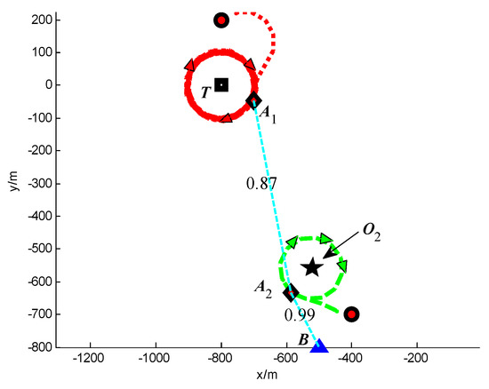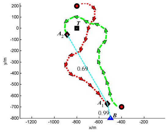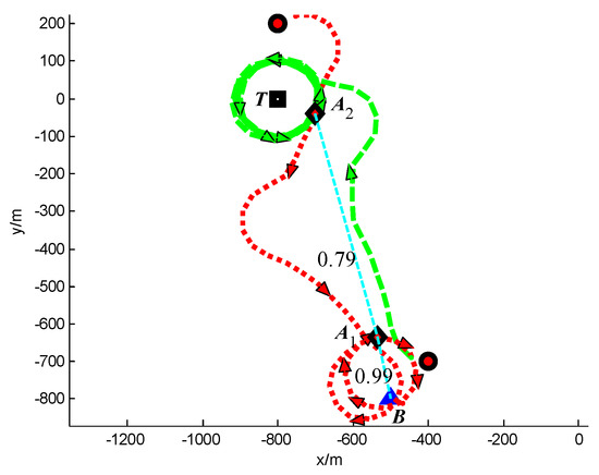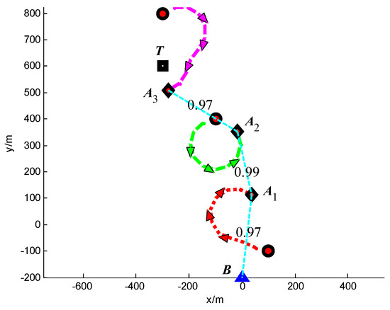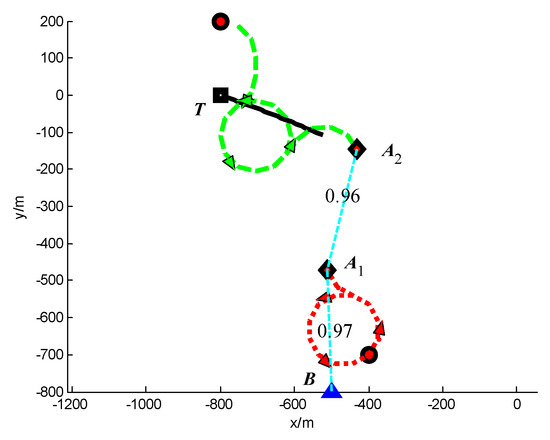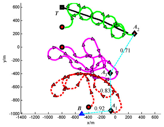 In Scenario 3, a moving target T is continuously tracked by three UAVs A1, A2 and A3. The detailed initial settings of the UAVs are listed in Table 6. The initial position of target is (−800, 600) m. The position of the base station B is (−500, −1000) m. The safety distance for collision avoidance is dsafe = 250 m. The other simulation conditions are same with Scenario 1.