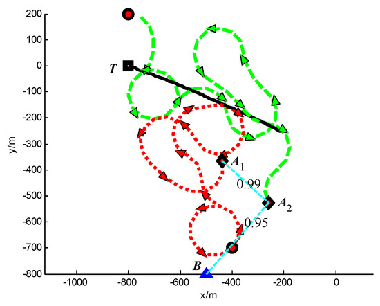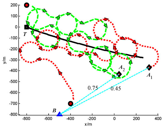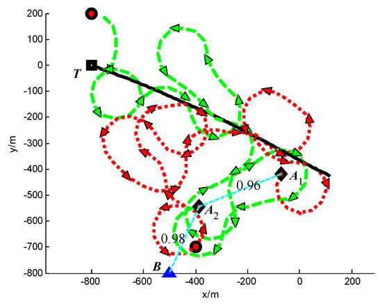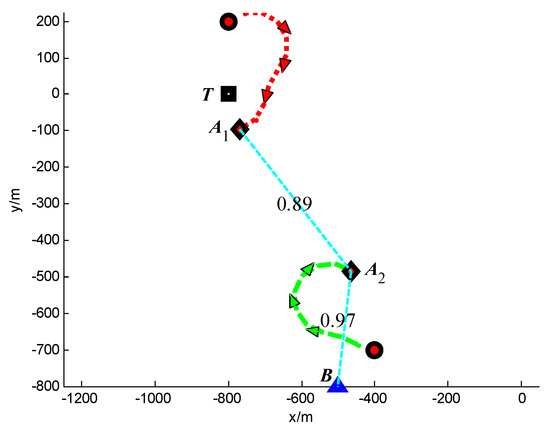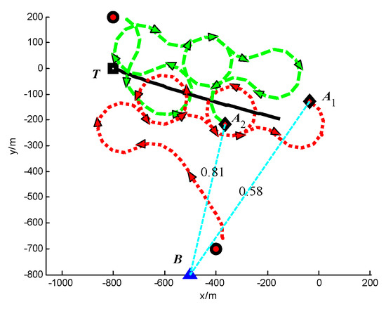 Trajectories of UAVs and target at t = 100 s (Group A in Scenario 3).
