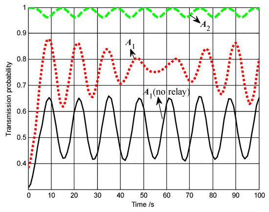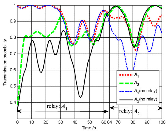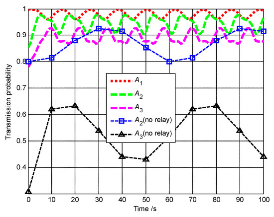 The communication performances of A1, A2 and A3 are shown in Figure 30. The average transmission probability of A2 can be improved to about 0.5. By contrast, if A2 communicates with the base station directly without any relay, its average transmission probability is lower than 0.1. Thus, the communication performance of A2 is vastly improved with A3 and A1 acting as the relays.