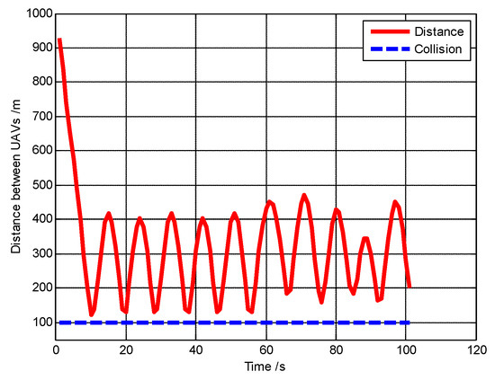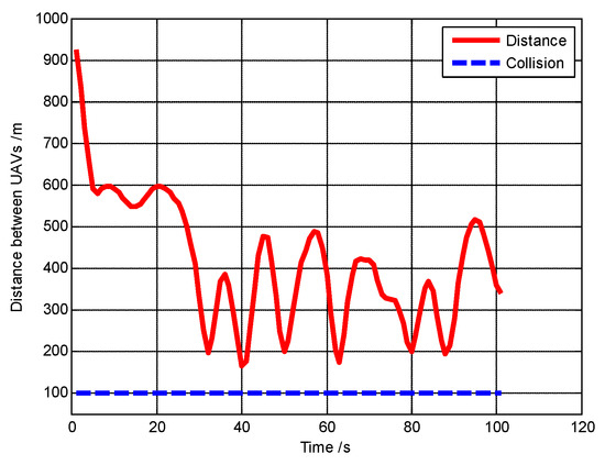 Figure 32 shows that the safety of the UAVs is guaranteed because the minimum distance between UAVs is always larger than the safety distance (dsafe = 250 m).