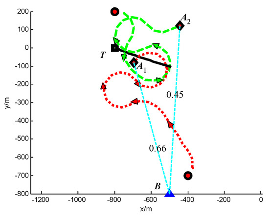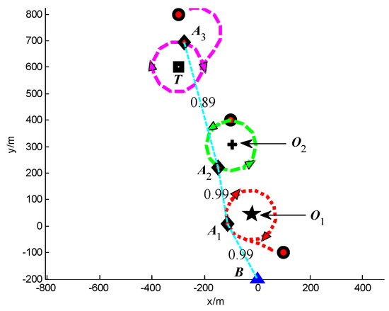 In Scenario 4, a single moving target T is localized by three UAVs A1, A2 and A3. The detailed initial settings of the UAVs are listed in Table 8. The position of the static target is (−300, 600) m, and the position of the base station B is (0, −200) m. The safety distance for collision avoidance dsafe = 100 m.