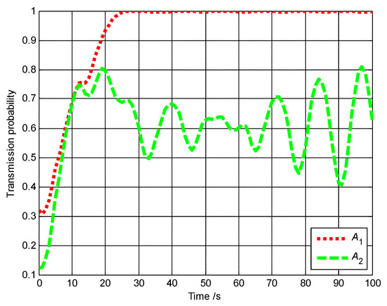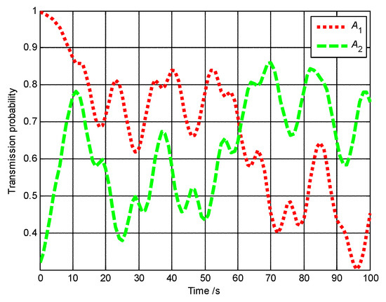 The communication performances of A1, A2 and A3 are shown in Figure 35. The average transmission probability of A3 is 0.8894. In contrast, if A3 directly communicates with the base station without any relay, its average transmission probability is only 0.5215. The communication performance of A3 is vastly improved with A1 and A2 acting as the relays.