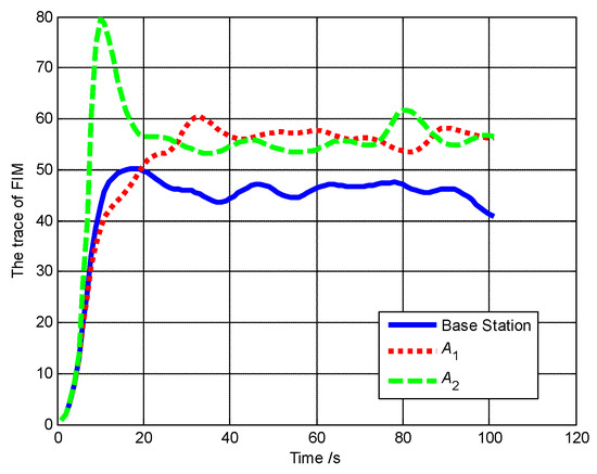 The trace of the FIM of A1, A2 A3 and base station is shown in Figure 36 during the whole simulation process. A2 gets close to the target to get better measurements and send its measurements back to the base station by the multi-hops chain {A3 → A2 → A1 → B}. Hence, the base station has good estimation performance.