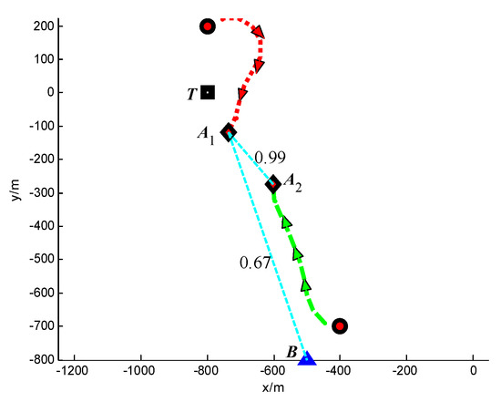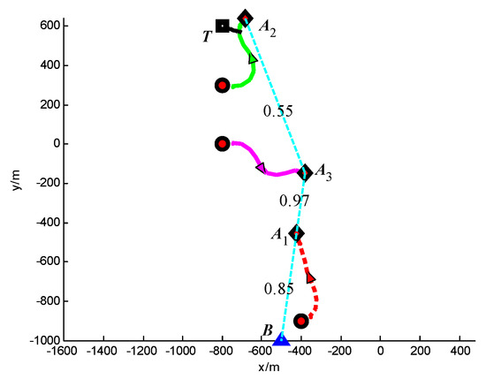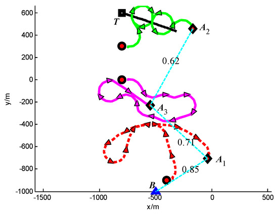 Trajectories of UAVs and target at t = 50 s (Group A in Scenario 3).