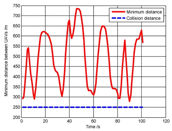 The minimum distance between the UAVs during the whole simulation process (Scenario 3).
