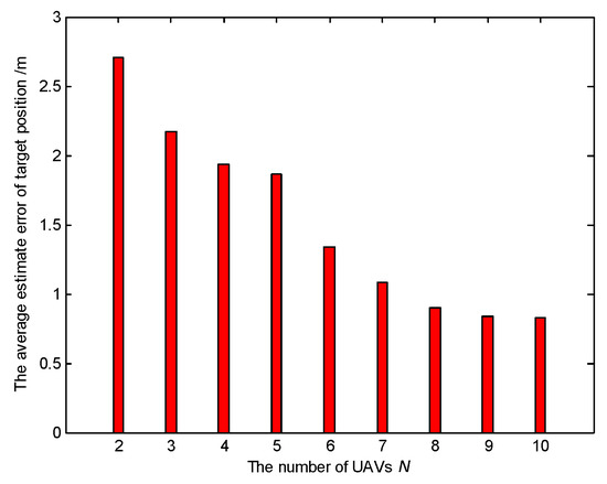In Scenario 5, we test the performance of the global estimation of the target state on the number of deployed UAVs. Using Monte Carlo simulations, we tested cases where the number of UAVs ranged from N = 2–10. For each case 100 independent experiments were performed. For each experiment, the initial positions and the initial heading angles of the UAVs, and the initial positions of targets are randomly generated in a 2 km × 2 km bound region. The ground speed of the UAVs is vi = 50 m/s, the maximum turning rate of the UAVs is ωmax = 30 deg/s. For the target, its initial position is (−1000, 1000) m, and its initial movement direction is −20 deg. The position of the base station B is (0, −1000) m. The safety distance for collision avoidance is dsafe = 200 m. The other simulation conditions are the same as Scenario 1.