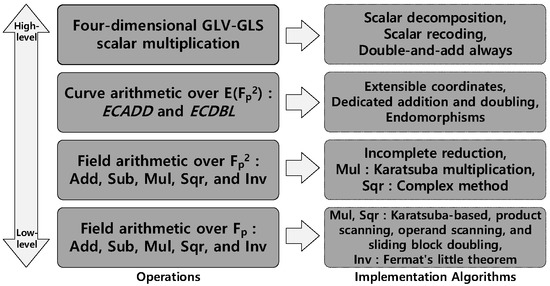 Figure 1 describes the implementation hierarchy of four-dimensional GLV-GLS scalar multiplication and its internal algorithms. Because the implementation algorithms at each level affect the performance of scalar multiplication, we carefully choose proper algorithms considering the features of AVR, MSP430, and ARM processors. Additionally, field arithmetic over and curve arithmetic are comprised of field arithmetic over , which is the computationally primary operations. Therefore, field arithmetic over is written at the assembly level.