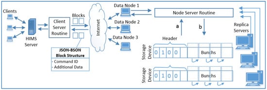 There are major theoretical and conceptual frameworks that were used in this study and can best be summarized under three headings: service-routines (client and server side), security issues (for secure connection), and developing distributed file system architecture (the main part of our system). Service routines have been implemented by using client–server socket tools to accomplish secure communication between client-side and server-side, client-service routine (CSR), and data-node service routine (DNSR). These services communicate with each other using transmission blocks that are shown in Figure 1, in JSON data structure over TCP/IP. Library files (DLL files) must be installed on the client application for the client application to integrate into the system. The CSR is responsible for sending the medical image files regardless of its size and type to DNSR and reading them on demand. The CSR sends the client application’s requests (HIMS) to DNSR with a secure connection. Also, one smaller Windows service has been implemented for replica nodes to search the files. Moreover, this service provides encrypted data transfer with the other nodes.