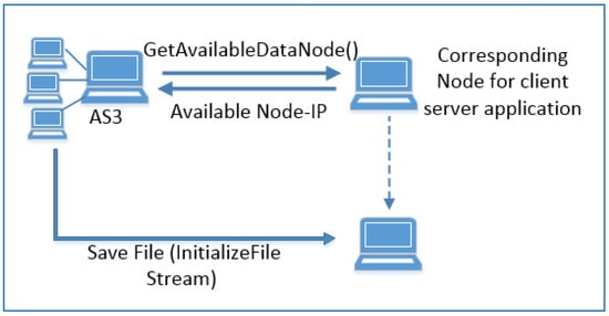 The data node, also responsible for the client application, runs/acts like a load balancer. This node sends the IP address of next data node that is responsible for file storage operation. Therefore, saving file operation is done in two steps. When the client application wants to store the file, it takes the IP value of the appropriate data node from corresponding data node. As mentioned before, corresponding data node means client applications has a proxy node which is responsible for routing operation.