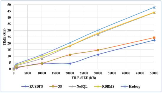 The system creates a file that occupies 80% of the total free space on the physical device. At this point, as shown in Figure 3, the file will form a continuous area on the physical drive. Thus, the required disk I/O will decrease. This file is divided into blocks called a bunch of 10 MB Figure 5 shows a bunch structure. A bunch consists of 3 bytes of next bunch information, 1 byte of data indicating to which replica server is kept, 4 bytes of client application IP, and 50 bytes of the file name and data block. The bunches behave exactly like an array, and the index number starts from zero. As shown in Figure 6, the disc header consists of 3 bytes of data holding the amount of bunch and 200 KB of data in bitmap format. Whether each bunch is empty or not is controlled by the bitmap structure, in which each bunch is represented by one bit and ‘1’ represents used or reserved bunch otherwise the bunch is empty, which means it is ready to be used in the file chain. This bitmap field size is 200 KB. Thus, a storage area of 16 TB is reached. Each bunch holds a 3-byte pointer that holds the next bunch in itself. Files that are bigger than a bunch size are kept in the file chain. As shown Figure 7, each bunch points to the next data block with of 3 bytes next pointer. The pointer holds the index of the next bunch. If this pointer is ‘0’, it means that the bunch represents EOF, in other words, this bunch is the last one of the file chain. Data nodes are responsible for storing, reading, deleting, and backing up the files sent to them. One of the most basic features of this structure is that the starting bunch number of the file stored in the nodes is sent with the file name and in this way/thus the reading starts with one disk access. With this feature, system performance is quite satisfactory. This situation is shown in Table 2. The result of comparing the performance values of KUSDFS with other systems is shown in the diagram in Figure 8.