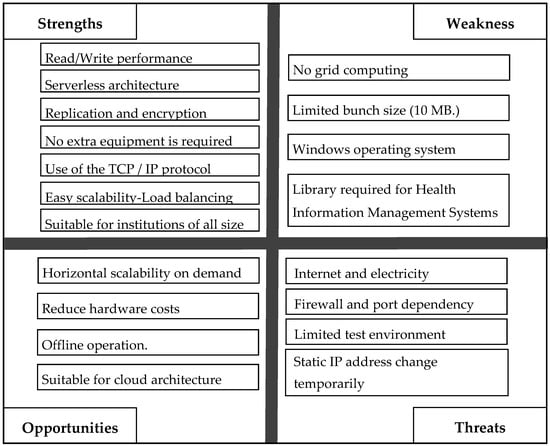 - Suitable for healthcare institutions by using 10 MB block size. Figure 9 shows the strengths, weaknesses, and opportunity features of the system.