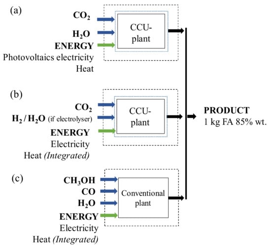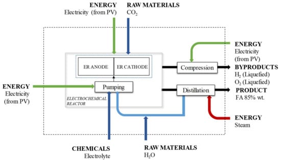 Conventional FA manufacture was assumed by means of hydrolysis of methyl formate. This route consists on a two-stage process: in the first stage, methanol is carbonylated with carbon monoxide (CH3OH + CO → HCOOCH3), and in a second stage, methyl formate is hydrolysed to FA and methanol (CH3OOCH + H2O → CH3OH + HCOOH). The CF of FA conventional process, as kg of CO2 per kg of FA produced is 2.2 kg·kg−1, which was obtained from Ecoinvent data []. This CF value could decrease up to 2.07 kg·kg−1 whether PV solar was supplied to a FA conventional plant instead electricity from the production mix.