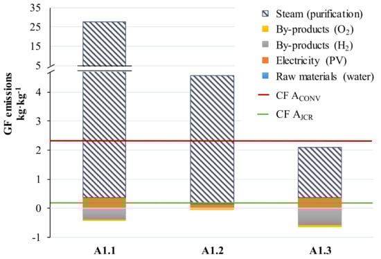 After a proper LCI was available for each individual case of production of FA, the CF calculations were accomplished with the values of the resources obtained in each alternative. It is worth mentioning that no direct emissions from the ER process are considered. Also, it must be highlighted that the CF calculation was run only for the A1.1, A1.2, and A1.3 alternatives, as the CF values for ACONV and AJCR were provided by the corresponding references [,,]. Ecoinvent database was used to obtain the CO2 equivalent emissions for the requested resources such as conventional FA production, H2O, H2, O2, and steam [], and the CO2 equivalent emissions for the requested PV solar energy were based on the results of a previous study []. The CO2 used as feedstock was considered not to contribute to the CF, as all the emissions are allocated to the corresponding main product, which can be electricity in the case of a coal-fired power plant. Figure 3 displays the CF values corresponding to each alternative, considering the next 5 resources: (i) steam for purification; (ii) avoided emissions from the byproduct O2; (iii) avoided emissions from the byproduct H2; (iv) electricity as PV solar energy for the reactor, the pumping, and the compression/liquefaction of H2/O2; and, finally, (v) the ionized water as raw material, using a functional unit of 1 kg of FA as reference, considering that the FA is at a concentration of 85% wt. The mass of CO2 per mass unit of FA was excluded from the use of resources, but in any case, it would represent a value of −1 kg·kg−1. The CF of the electrode materials and catalysers were neglected, as their lifetimes were assumed to be long enough.