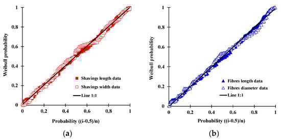 Weibull probability-probability plot of the (a) length and width of the metallic shavings and (b) length and diameter of metallic fibres.