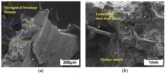Moreover, Sengul [] demonstrated that recycled steel fibres from ELTs (diameter 0.1–2 mm) could be used to reinforce cement-based materials, although their compressive and flexural properties were lower in comparison with materials reinforced with commercial metallic fibres. Wu et al. [] highlighted that one of the disadvantages of the addition of fibres in cement-based materials is the reduction of their workability, which can affect the microstructure and physical properties of cement-based materials. In this context, Lee and Jacobsen [] evaluated the microstructure of mortars with steel fibres using Scanning Electron Microscopy, concluding that the porosity present in the interface matrix-fibre increases the total porosity of the mortar. Therefore, this increase of the total porosity can cause a decrease in the mechanical properties of the mortars. Nevertheless, this negative effect can be variable depending on the amount of metallic fibres added to the mortar matrix and on the type of mechanical test used to evaluate the effect of fibres [].