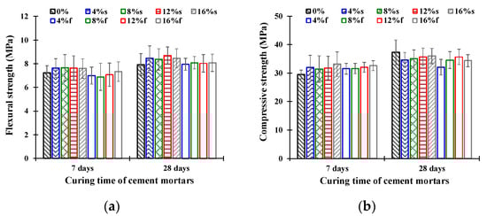 Average results of mechanical strength: (a) flexural and (b) compressive strength of the mortar specimens with different waste type, content, and curing times (s: shavings; f: steel wool fibres).