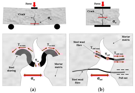 Schematic representation of the cracking produced during the strength tests: (a) flexural and (b) compressive tests for the cement mortar specimens with shavings and steel wool fibres, respectively. Symbol statement: Tensile strength (st: Specimen test; ss: Steel shaving; swf: Steel wool fibre); : Shear strength (ss: Steel shaving; swf: Steel wool fibre); and : Contact surface adherence load (ss: Steel shavings, swf: Steel wool fibre, mm: Matrix mortar).