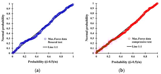 Normal probability-probability plots for the maximum force values registered under the (a) flexural and (b) compressive tests.