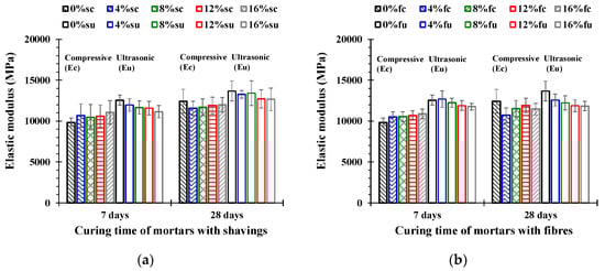 Figure 9 shows the average results of the static elastic modulus obtained from compressive tests (Ec) and the dynamic elastic modulus obtained from ultrasonic tests (Eu) of specimens with different amounts of fibres and shavings. From this Figure, it can be observed that: (i) the compressive elastic modulus proportionally increased with the increase of the amount of metallic waste added to the mortar, while (ii) the dynamic elastic modulus obtained from ultrasonic tests proportionally decreased with the increase of metallic waste.