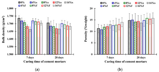 Average results of (a) bulk density and (b) porosity of the cement-mortar specimens with different waste content and curing times (s: shavings; f: steel wool fibres).