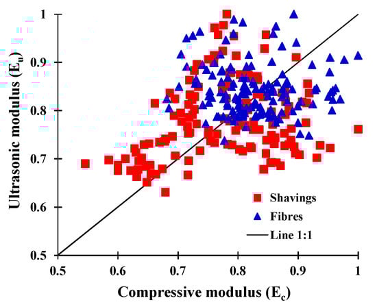 Additionally, although previous works [] proved that both elastic modulus types are physically related, we were not able to determine the static elastic modulus from the compressive test (Ec), knowing the dynamic elastic modulus from ultrasonic tests (Eu). With the aim of demonstrating this, Figure 11 shows the relationship between the elastic modulus obtained from compressive and ultrasonic tests, measured on the same test specimen for all the specimens tested.