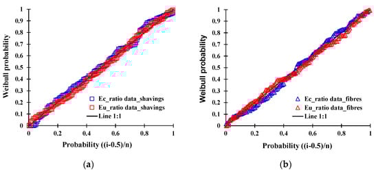 Weibull probability-probability plots of the Modulus Influence Ratios (MIRs) data, for all specimens reinforced with (a) shavings and (b) fibres.