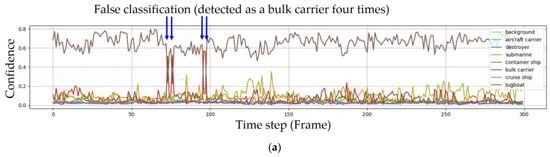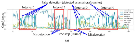 First, let us consider Intervals 1 and 4 in Figure 8. In the two intervals, the destroyer was falsely classified as an aircraft carrier, as shown in Figure 8a,b. In particular, the target ship was classified not as a destroyer but as an aircraft carrier in six frames in a row from frame 235 to 240. However, the proposed method overcame the false classification problem and the confidence for the destroyer progressed steadily to one, as shown in Figure 8c. Second, consider Interval 2. In this interval, the destroyer was not detected and was actually classified as background by the IoU tracking several times. However, the proposed method again overcame the misdetections again and the confidence for a destroyer progressed steadily to one, as shown in Figure 8c. Third, consider Interval 3, which was slightly different from Intervals 1, 2 and 4. Unlike the previous intervals, several misdetections and tens of false classifications occurred together in Interval 3. The proposed method worked well even for this challenging situation for the first 30 frames but the frequency of the misdetection and false classification exceeded a certain threshold. Moreover, our algorithm failed to classify effectively and returned the wrong result.