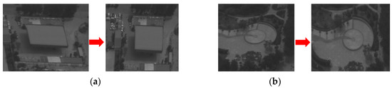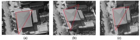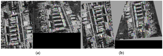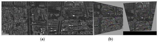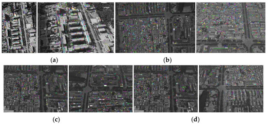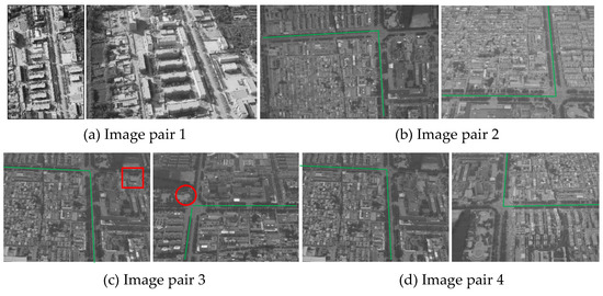 - Comparing results of the first and second image pairs, it is found that both of these image pairs are down-looking and back-looking; however, for the first image pair, the correct matching rate is 62.9% under LJL processing, and 79.1% under Perspective–LJL; this is lower than the rate of 78.3% and 93.2% for the second image pair. Meanwhile, for the increase in the number of matched lines (both total number and the correct number), the effect of the second image pair is significantly better than that of the first image pair. In other words, the matching effect of the first image pair and the improving effect of Perspective–LJL on the first image pair is weaker than those observed in the second image pair. By observing the buildings’ distribution and topography in these two surveying areas, it can be seen that the elevation difference of buildings in the first image pair is large. There are many spatial planes with obvious differences, and occlusions are more serious. In the second image pair, most buildings are flatly distributed, and there are uniform deformations. It is appropriate to use a plane to fit the surfaces of these buildings, and the occlusions are not obvious. When the perspective transformation model is used to rectify buildings to a new spatial plane, the deformations can be well rectified.