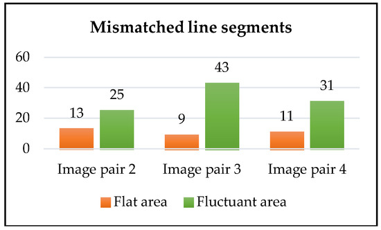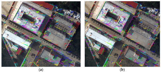- There is a large gap between the matching results of the four oblique image pairs with respect to the matching results of conventional images (Table 1). The matching accuracy rate is far less than 97%. There are thousands of lines extracted from the two pairs of down-looking and back-looking images; however, only a small proportion of lines are matched. The number of matched line segments is 186 and 166, whereas the accuracy rate is only 62.9% and 79.1%, respectively. Especially in the last two pairs of side-looking images, the baselines are wider and the difference in viewing angles is larger; therefore, the matched line segments are fewer in number, and the accuracy rate is 0% and 13.3%. The data fully reflects the matching difficulty of images with wide baselines and large viewing angles.