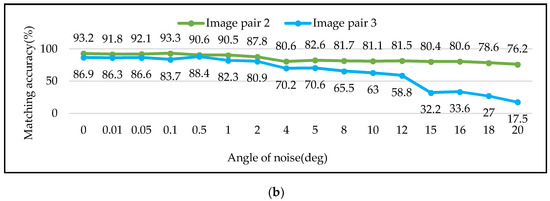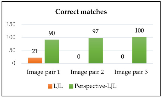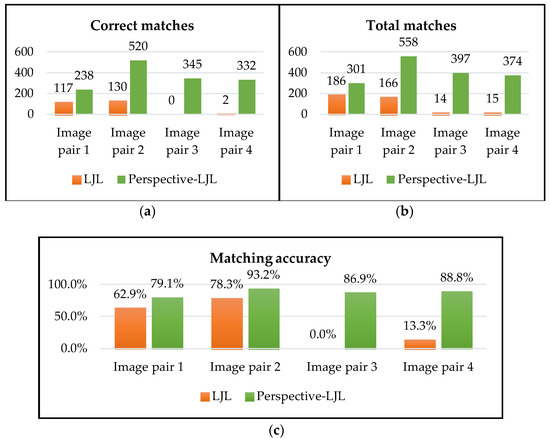 - By using the Perspective–LJL method, the matching accuracy rate is improved to 79.1%, 93.2%, 86.9%, and 88.8%, respectively; however, there still exists a gap of improving the matching rate up to 97% of the short-baseline images. This indicates that the perspective transformation model can only eliminate some of the perspective effects, and cannot completely solve the problems caused by large viewing angles.