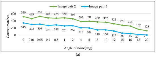 Image pairs 2 and 3 were taken as test objects. Because the IMU angles are the main factors which affect the POS accuracy, different grades of noise were added to the three rotation angles. To this end, 15 different noisy angles ranging from 0° to 20° were chosen. Figure 18a,b show the number of correct matches and the matching accuracy under different noisy angles, respectively. For a better comparison, the number of correct matches using the LJL method (Figure 18a), which is a constant value of 130, is shown. Similarly, the matching accuracy values of 78.3% are shown in Figure 18b.
