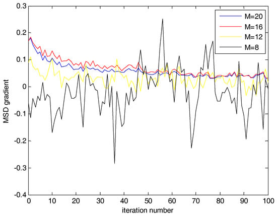 Figure 1 plots the MSD gradient of different tap-lengths (8, 12, 16, and 20) in an identification system. This system was set up with the best tap-length of 16. The reference input was obtained by passing white Gaussian noise through a transfer system of . Transfer system H(z) was referenced from Yu and Cowan []. The length 16 of the identification system was adopted from the white Gaussian random sequence with zero-mean and unity variance. The signal-to-noise ratio (SNR) of 10 dB was obtained by adding white Gaussian interference noise. Different tap-lengths had different MSD gradient performance. In the first half of the iteration, the red line (M = 16) had the largest . In the latter half, although the black line (M = 8) had a fluctuating and negative MSD gradient, part of the black line was larger than the red line. This is because under-modeling appears in the black line. As its tap-length is smaller than the optimum value, the difference between its coefficient and the optimum is very large. Large and fluctuant MSD results in a large MSD gradient that is incorrect. Thus, the closer to optimum the tap-length is, the larger the amplitude of MSD gradient that will be obtained. For achieving the fastest convergence rate and the best tracking capability, the tap-length should be close to the optimum. In this case, MSD will undergo the largest decrease at each iteration and also guarantees the achievement of the lowest possible steady-state MSE []. Furthermore, a variable tap-length potentially gains significant computational savings. For an unknown environment, an efficient variable tap-length algorithm provides better results. The fractional variable tap-length algorithm is a favorable strategy, as explained below.