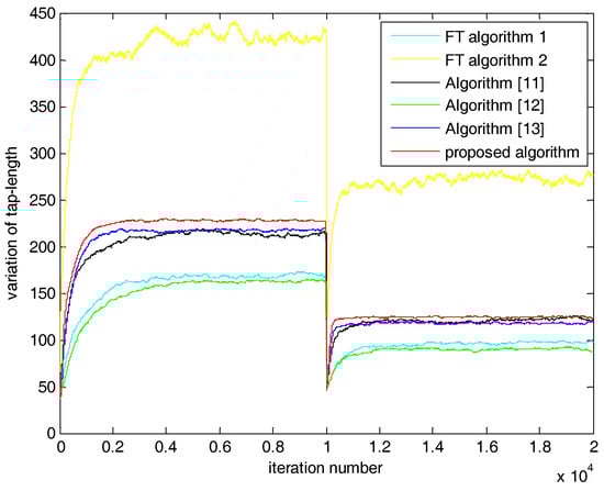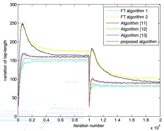 We show the variation of tap-length in Figure 2 and Figure 3. As FT Algorithm 1 adopted the minimum error width, the under-modeling problem appeared. At the beginning, FT Algorithm 2 and the algorithm introduced by Mayyas et al. [] had a large convergence rate. However, severe overestimation appeared. Tap-lengths of the algorithms introduced by Han et al. [,] were in the optimum range. However, the accurate ST and error width of the proposed algorithm made the corresponding tap-length estimate more accurately. The proposed algorithm maintained their advantages and mitigated their disadvantages. Before 1000, 10,500, 1300 and 10,400 iterations in Figure 2 and Figure 3, the slopes of the proposed algorithm were larger than that of the algorithm in []. The variation of tap-length in the proposed algorithm was relatively faster than that in the algorithm in []. The algorithm in [] had a little overestimation at the beginning of iteration. The peak of the algorithm [] was larger than that of the proposed algorithm. The performance of the proposed algorithm is the balance of these two algorithms in [,]. The proposed algorithm slightly improved the initial convergence speed compared with the algorithm in [] and improved the overestimation of tap-length compared with the algorithm in [].