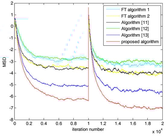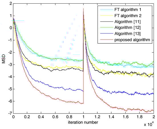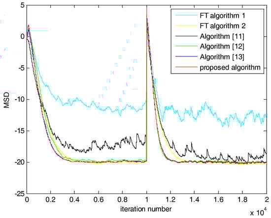 Next, we compared MSD performance. The variation of tap-length correlated with MSD performance. Given the under-modeling problem in FT Algorithm 1 shown in Figure 2 and Figure 3, FT Algorithm 1 had the worst MSD performance. Similarly, lacking the varying strategy of ST or error width, MSD of FT Algorithm 2 and that of Mayyas et al. [] were weaker than the other algorithms. Han and coworkers’ algorithms [,] had their respective strategies of error width or ST. However, their performance was also slightly affected by the lack of the other parameters. In the first half of Figure 4 and Figure 5, MSD of Han and coworkers’ algorithm [] was stable at 4000 and 5000 iterations. Its MSD convergence speed was slower and its MSD was larger than the proposed algorithm. The MSD of Han and coworkers’ algorithm [] fluctuated in the second half of Figure 5. As the proposed algorithm used strategies of ST and error width, it improved the stability and convergence performance compared with the other algorithms.
