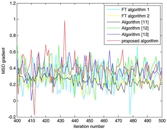 Different algorithms had different MSD gradient performance. MSD gradient is from Equation (5). It indicates the MSD difference between two moments in each iteration. The larger is the MSD gradient, the better is the performance that will be obtained. In Figure 10 and Figure 11, although the proposed algorithm fluctuated, its peak and bottom values were larger than those of the other algorithms. To better compare these algorithms, we calculated the mean values of the MSD gradient (Table 2). As shown in Table 2, although these variable tap-length algorithms improved MSD gradient to a certain extent, the proposed algorithm still had the largest MSD gradient. In combination with the MSD results and MSD gradient, the proposed algorithm led MSD to undergo the largest descent at each iteration. It also guaranteed the achievement of the best possible MSD performance.