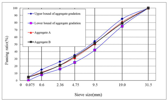 In order to improve the reliability of the test results, two kinds of aggregate that have different air voids were used. The aggregates were made of limestone. The density and moisture absorption are listed in Table 1, respectively. The gradations of the two kinds of aggregate are shown in Figure 1. ASTM Type I Ordinary Portland cement was employed in the experiments; the properties are shown in Table 2.