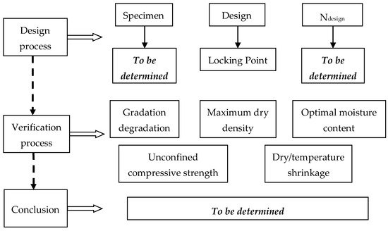 In the design process, the specimen height, design indicator and design compaction number Ndesign were determined. Subsequently, in the verification process, five indexes were conducted, including gradation and degradation, maximum dry density, optimal moisture content, unconfined compressive strength and dry/temperature shrinkage coefficient. The detailed research procedure is shown in Figure 3.