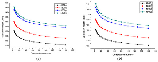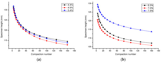 Relationship between compaction number and specimen height for (a) Aggregate A under a moisture content of 4.4%, 4.9% and 5.4% and (b) Aggregate B under a moisture content of 6.5%, 7.0% and 7.5%.