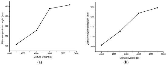 According to Figure 5, the ultimate specimen height was calculated, and its variation with mixture weight is shown in Figure 6.