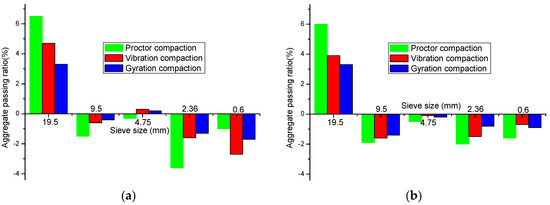 Aggregate gradation has a significant influence on the performance of CTAM. Thus, in this section the aggregate degradation after the Proctor, vibration and gyration compactions were compared. The detailed aggregate degradations of Aggregate A and Aggregate B are shown in Figure 8.