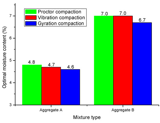 In addition, we also found that the maximum dry density of Aggregate A was higher than that of Aggregate B, and the optimal moisture content of Aggregate A was lower than that of Aggregate B. The phenomenon was attributed to the lower void content (or lower moisture absorption) and higher density of Aggregate A than of Aggregate B.