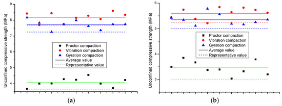 It was found that the results of the two aggregates under each compaction method had consistent variation trends. The average and representative strength values under vibration compaction were the highest, followed by those under gyration and Proctor compaction, respectively. Despite the two aggregate gradations having the same cement dosage, the strength values of Aggregate A were generally higher than those of Aggregate B, which was in part attributed to the different aggregate strengths and void contents of the two gradations.