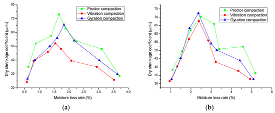 Figure 13a,b shows that the dry shrinkage coefficients of Aggregate A and Aggregate B both presented parabola variations with increasing moisture loss rates. The maximum dry shrinkage coefficients under the different compaction methods happened between 6–8 h. Compared with Aggregate A, Aggregate B had higher moisture absorption, which led to higher aggregate shrinkage. Thus, Aggregate A had a higher dry shrinkage resistance than Aggregate B.