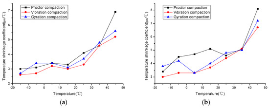 The temperature shrinkage coefficients shown in Figure 14 increased with increasing temperature. The temperature shrinkage coefficient under Proctor compaction was generally the highest, followed by those under gyration and vibration compaction, which was in part attributed to the results of the aggregate degradation shown in Section 4.2.1, because finer aggregates were easier to shrink under the same conditions. In addition, the temperature shrinkage coefficient of Aggregate B was higher than that of Aggregate A, because Aggregate B had a higher air void, resulting in easier temperature shrinkage of the aggregate.