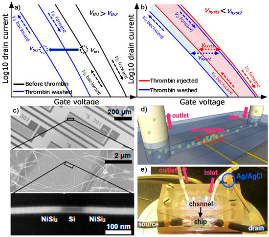 (a) Schematic representation of expected shift of the transfer curve upon thrombin binding on the surface. (b) Expected shrinkage of the hysteresis in presence of thrombin in solution. (c) Details of the biosensor including microelectrodes and nanowires. Bottom panel shows the formed nickel silicide after the annealing process. (d) Concept depiction of the fluidic channel on the sensing area, and (e) fluidic assembly including mechanical clamping system, tubings, and electrical connections.