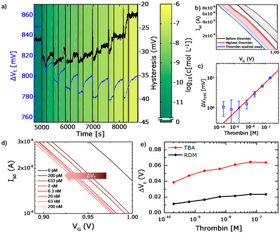Subthreshold shift dVT for thrombin detection: Furthermore we analyze dVT upon addition of the thrombin into the solution. Magnified details of the corresponding ISD-VG curves are displayed in Figure 3d. It demonstrates the accumulation of the thrombin-induced voltage shifts upon increasing concentrations from 0 (lowest concentration tested: 200 pM) to 200 nM, from the right (buffer curve) to the left (maximal concentration 200 nM). Note the progressively smaller voltage shifts at higher concentrations of the injected thrombin, which is potentially attributed to a gradual saturation of binding sites on the sensor surface. To analyze dVTi induced by thrombin attachment, the corresponding VG at a fixed ISD at different times ti (with t = ti after thrombin attachment and rinsing for each concentration Ci) are determined at a level where the subthreshold slope is steepest in the semilogarithmic plot. Although this point is in the subthreshold regime and therefore below the conventional threshold of field effect transistors, we deliberately define this point of measurement as our sensor threshold voltage VT since there is only a constant offset to the point where the transistor actually turns on. The VT value is calculated as the mean value of both branches of the FET gating hysteresis at each time step. Apart from the instantaneous change of VT, we plot the fragments of the transfer characteristics, depicting the negative shift of the curve upon increase of the thrombin concentration from 0 (200 pM lowest concentration) to 200 nM (Figure 3d). For each dVT value at different thrombin concentrations, the running mean of 15 neighboring VT values is taken after the signal saturation and is averaged to flatten the curve, resulting in a small error bar of dVT of less than 1 mV. Figure 3e summarizes the dVT measurements and displays the calibration curve where the mean dVT is represented as a function of the thrombin concentration trapped by the specific TBA at the sensor surface (red line). Note that dVT is found to be significantly higher for the aptamer decorated surface compared to the negative control surface with RDM (red and black curves, respectively), indicating a primary specific interaction of TBA with thrombin, whereas the signal increase for the RDM functionalized surface is caused mainly by unspecific protein adsorption. In summary, the presented method enables the detection of the thrombin concentrations as low as 200 pM, which is within the range presented by other aptamer based FET sensors for thrombin detection [25,47]. The achieved sensitivity reaches approximately 10 mV/dec, which is also comparable to recently published SiNW-based FET biosensing using antibodies [52].