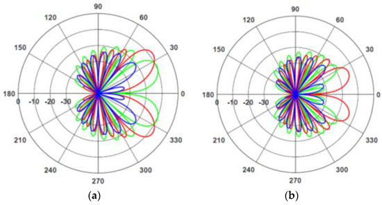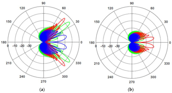 The elementary radiation patterns of the lines (green), (red), and (blue) in logarithmic scale for different values of phase shift. . (a) ; (b) .