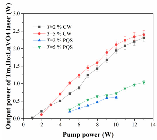 Output power of Tm,Ho:LuVO4 laser in CW and PQS mode operations verse the pump power.
