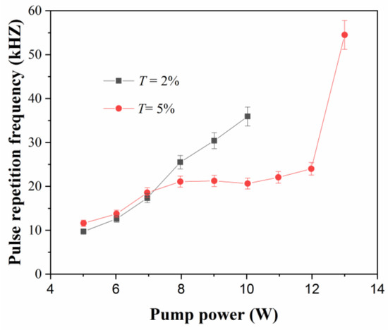 Two kinds of OC mirrors (with transmittances of 2% and 5%) were chosen in CW and PQS mode operation of an a-cut Tm,Ho:LuVO4 laser to achieved optimal output performances. In CW and PQS mode operations, the output power and the average output power of the laser are shown in Figure 2. Under the CW mode operation, output powers of 2310 and 2398 mW were achieved with 2% and 5% transmittances of the OC mirror, and optical–optical conversion efficiencies were 17.8% and 18.5%, respectively. In the PQS mode operation, a graphene SA mirror placed between M5 and OC mirror was located near the OC mirror. The transmittance of a few-layer graphene material at 2075.72 nm was measured and found to have been approximately 88.6%, and the modulation depths were 69.0% (T = 2%) and 58.3% (T= 5%). The laser spot radii on the surface of M6, left end face of laser crystal, right end face of laser crystal, M5, graphene SA and the OC mirror were calculated to be approximately 445, 416, 395, 367, 310 and 310 μm, respectively, by the ABCD matrix without considering the thermal lens effect. The average output powers of 604 and 1034 mW were achieved with 2% and 5% transmittances of the OC mirror, respectively, corresponding to optical–optical conversion efficiencies of 6.0% and 8.0%. In the PQS mode operation of Tm,Ho:LuVO4 laser, the pump threshold power was approximately 5 W with a 2% or 5% transmittance of the OC mirror. The laser was operated under a stable condition, and the pump power of 10.03 W or 13 W was injected into the laser cavity with a 2% or 5% transmittance of the OC mirror to avoid the damage of the graphene SA. Compared with the high transmittance of the OC mirror, a low transmittance of OC was chosen to acquire a stable PQS mode operation, due to more energy being stored in the crystal, but the damage threshold of the SA was easily reached, and the graphene SA was damaged at a peak power density of approximately 0.019 MW/cm2 at 2057.03 nm with a 2% transmittance of the OC mirror in the experiment.