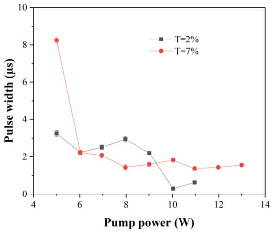 Pulse widths of Tm,Ho:LuVO4 laser verse the pump power.